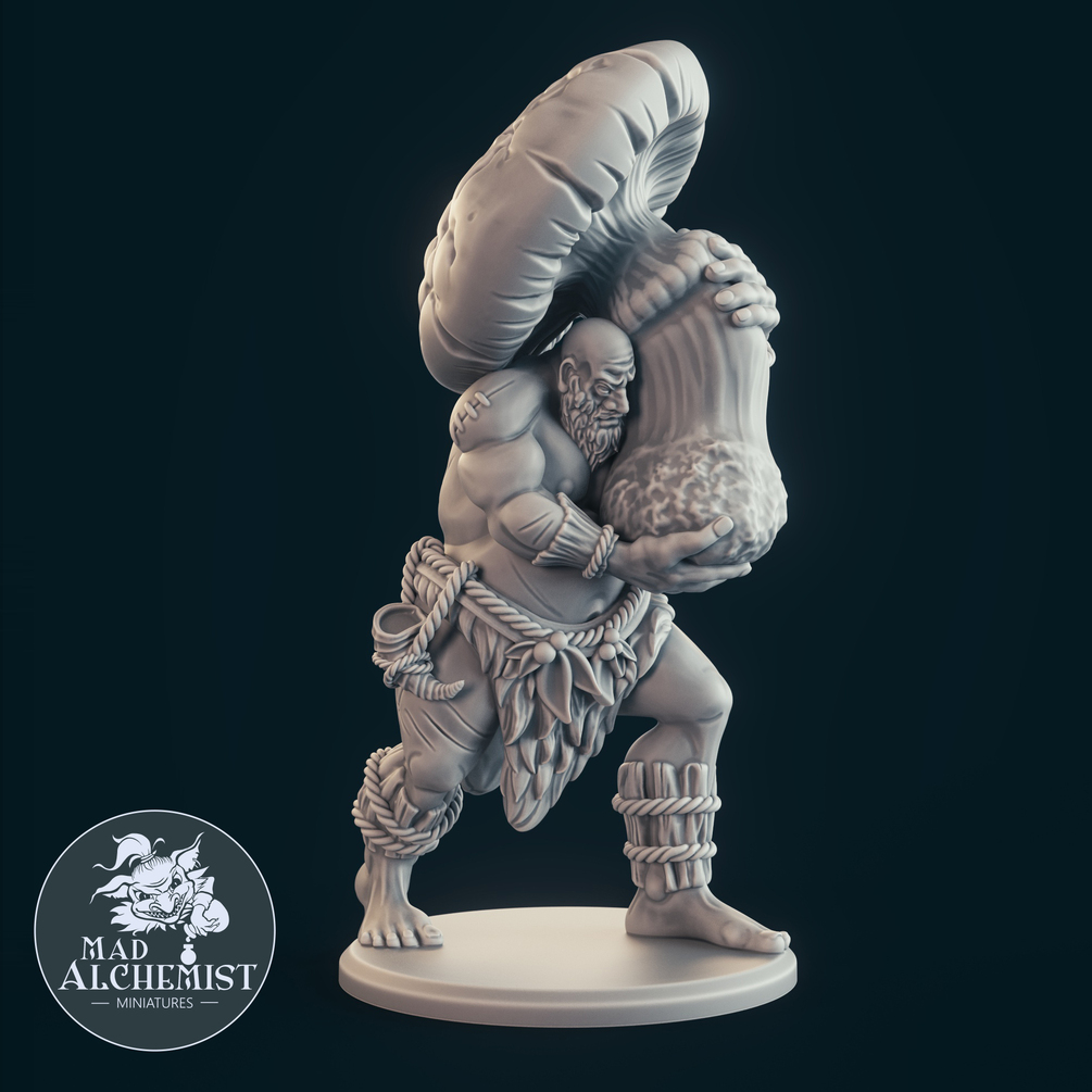 A giant with a huge mushroom. He seems to be the gardener of the other mutated mushrooms.